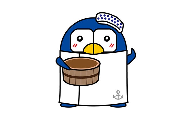 「温泉ぺるりん」は手ぬぐいと風呂桶がトレードマーク。