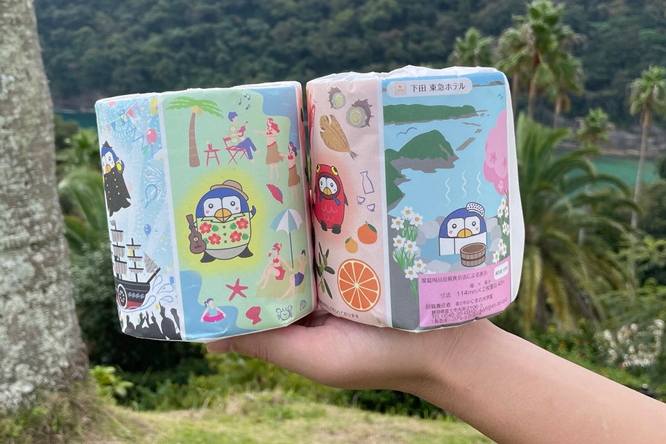 下田東急ホテル(静岡県下田市 総支配人:伊庭勝彦)では、SDGs推進活動の一環として全館で使用するトイレットペーパーを再生紙に切り替える取り組みを行ってきました。そして10月より、トイレットペーパーの包装紙を、下田市のゆるキャラ「ぺるりん」のデザインに変更します。手に取った皆さまが、下田の魅力を知ると同時に、環境活動に賛同していただくきっかけにしたいと考えています。