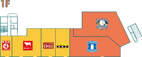 施設の顔となる1階は、ファミリー層を中心に個性豊かな人気の飲食店、大型野球用品専門店等が路面に並ぶグルメファンと野球ファンが楽しめるフロアです。