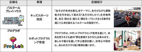 キッズスポーツ施設「パルクールプレイハウス」やロボットプログラミング教室「プログラボ」が並ぶ、スポーツ・学び・子育てをテーマとしたフロアです。