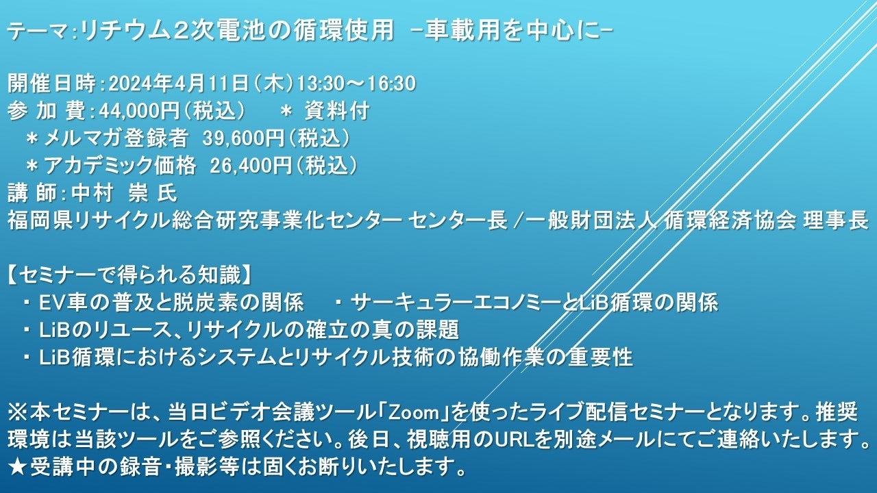 【ライブ配信セミナー】リチウム2次電池の循環使用 -車載用を中心に- 4月11日(木)開催 主催:(株)シーエムシー・リサーチ