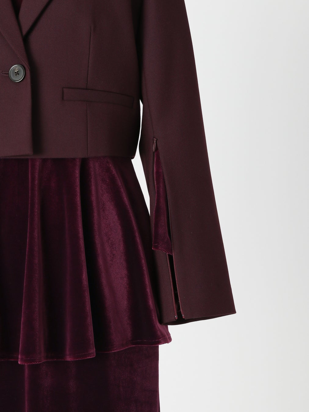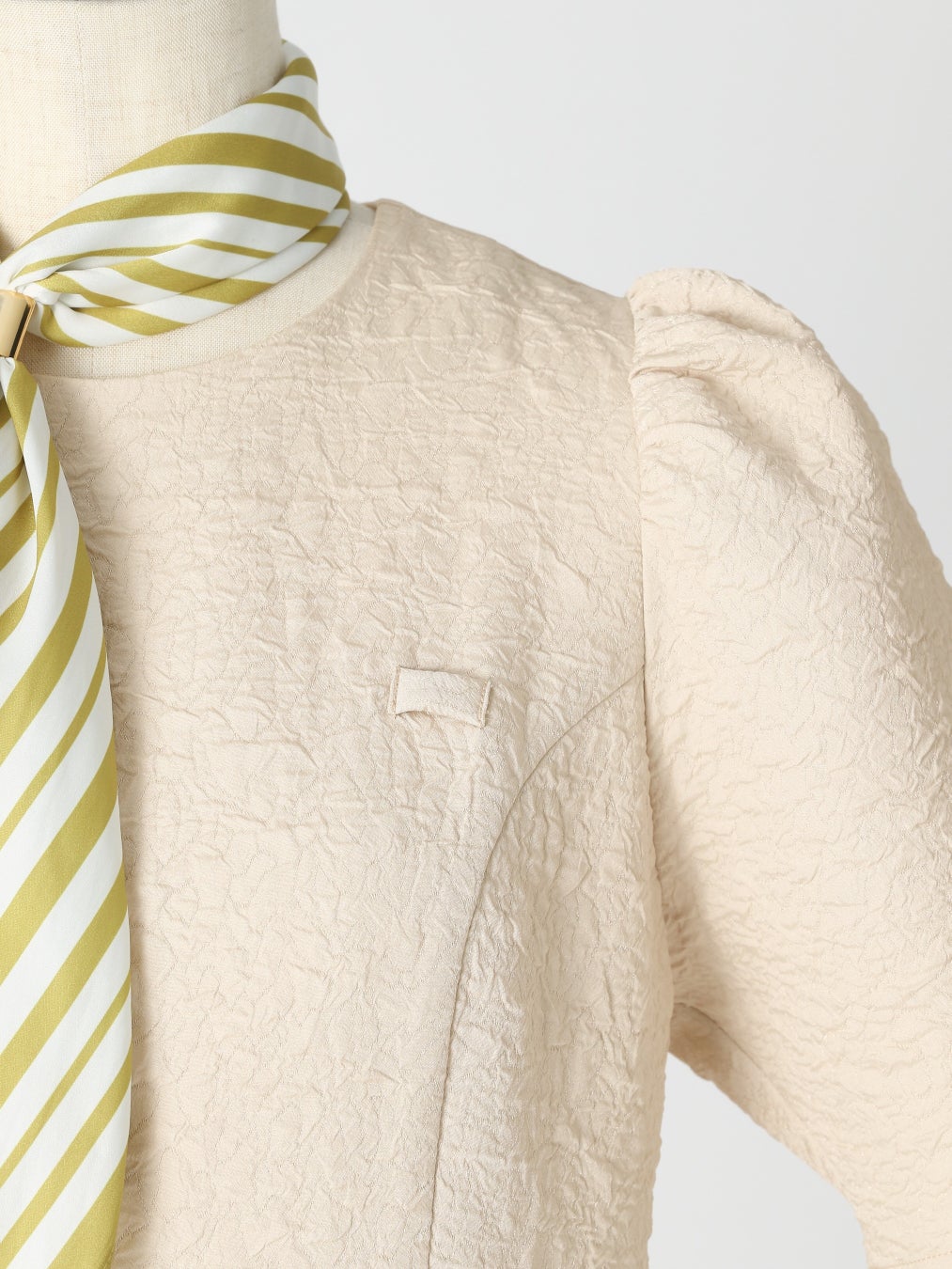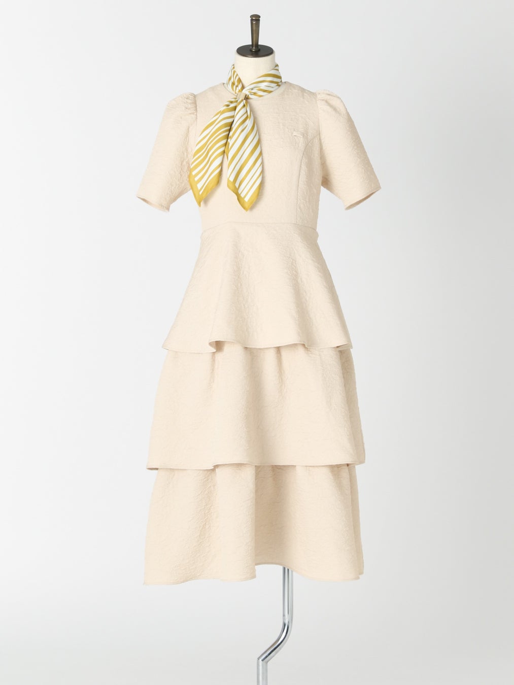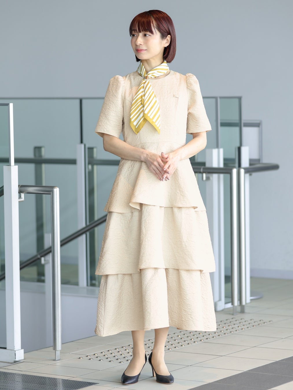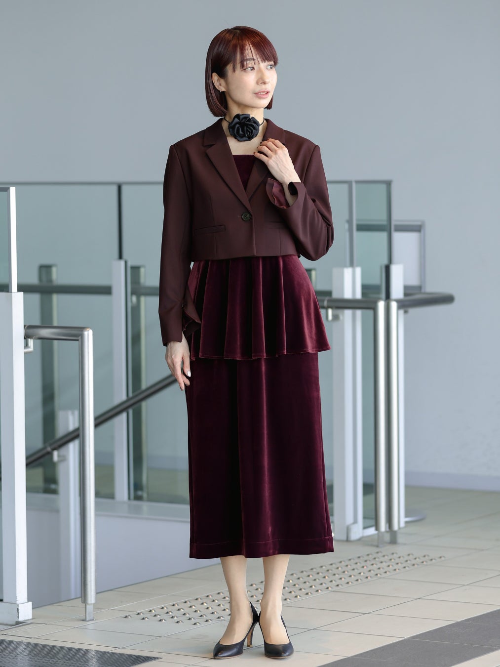 <ほどよいトレンド感とファッション性> ジャケットの着丈を短め丈とファスナー付きスリット袖にすることでトレンド感がある仕上がりに。 ワンピースにティアードやペプラムのデザインを取り入れることで、テーマにある華やかさをプラスしました。 素材は春夏は華やかなジャガード素材、秋冬の素材には光沢のあるシックで高級感が素敵なベロアを採用。小物はクチュール感のあるコサージュと、ヒカリエのスペクトル柄がプリントされたスカーフの2種類です。