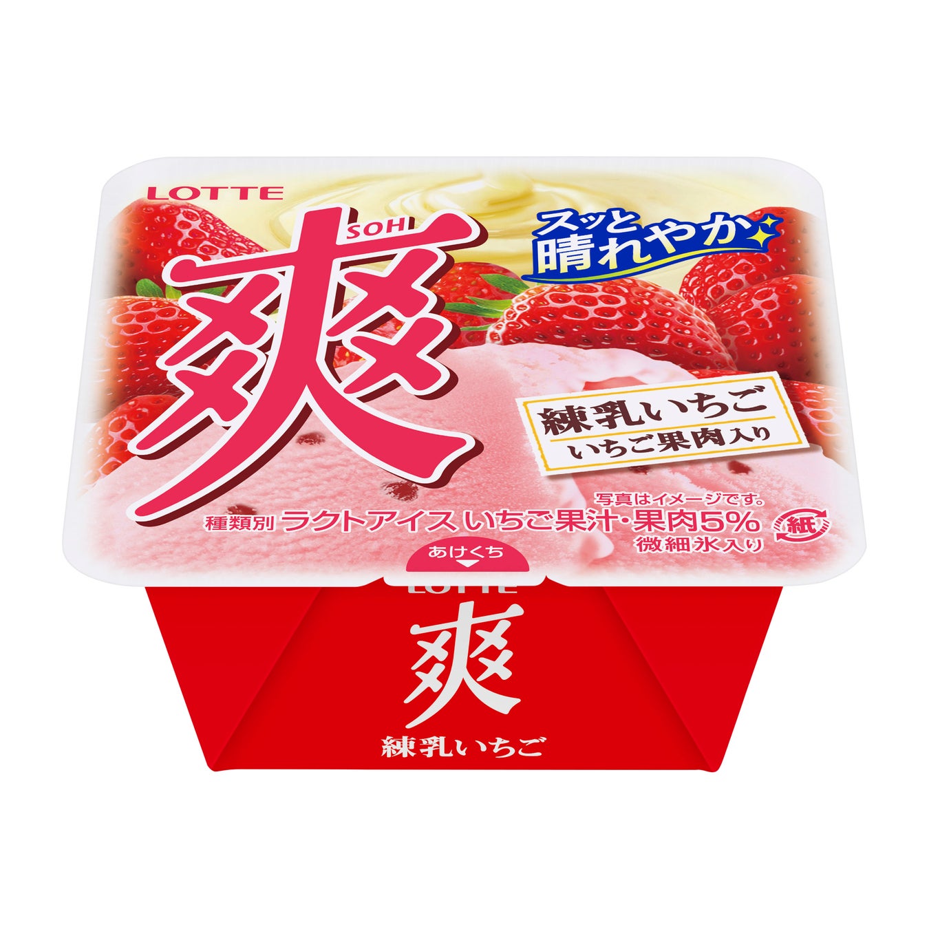 心までスッキリ晴れやかになります。『爽 練乳いちご』は、いちご果汁・果肉5%使用で練乳をしっかり味わいつつ、ほど良い酸味のいちご果肉が加わり、絶妙なバランスに仕上げました。微細氷が織りなすくちどけの良いおいしさと食感で、ほっと一息ついてココロとカラダをリセット。前向きな気持ちになれるカップアイス『爽』を、ぜひお試しください。
