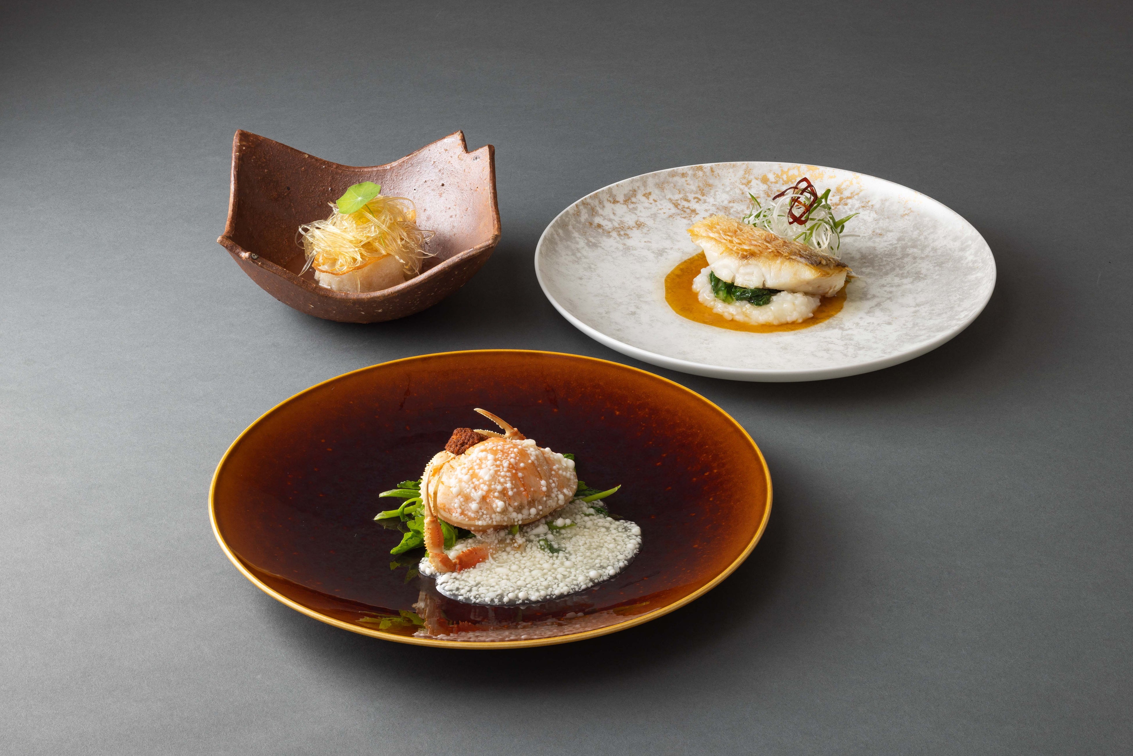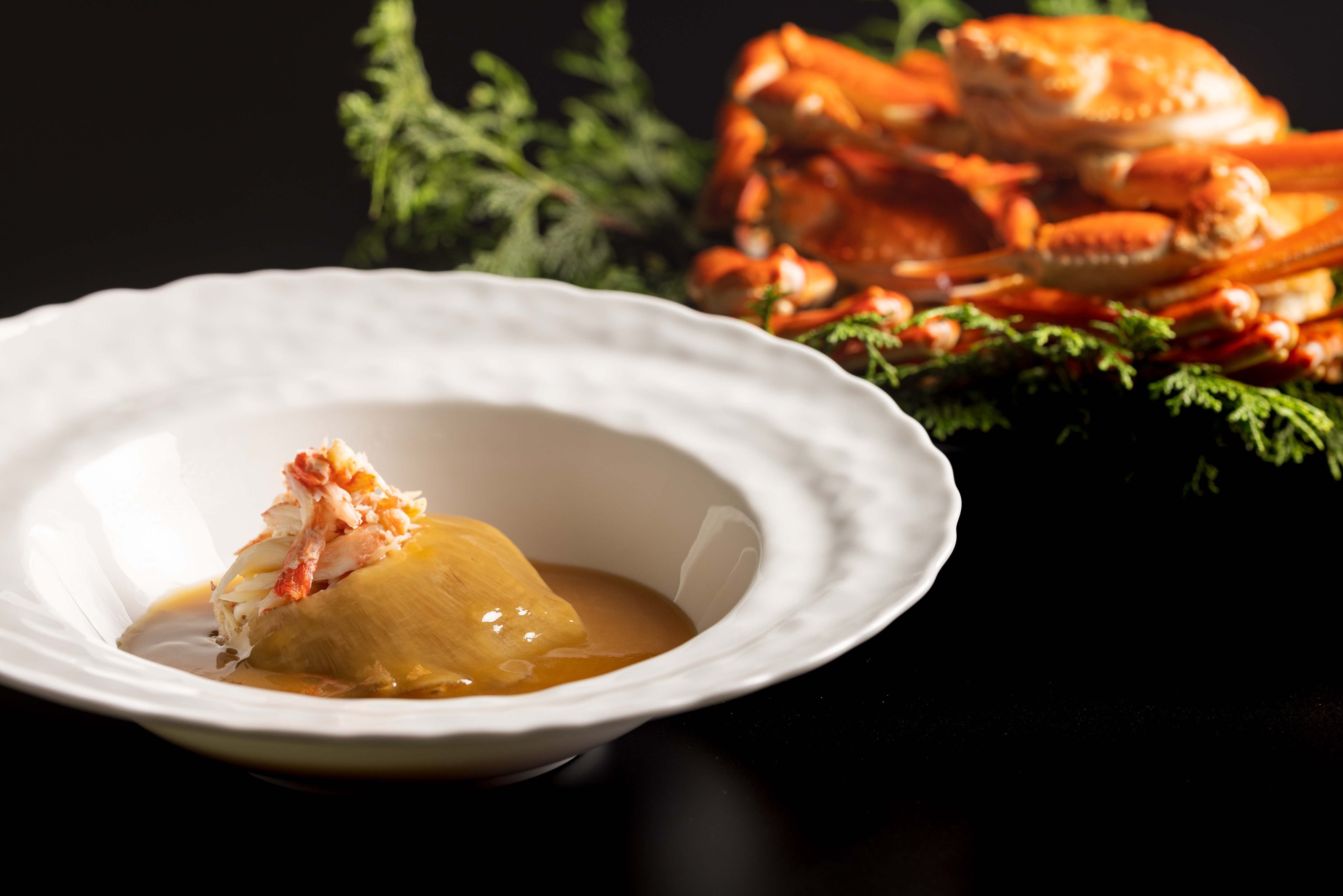 まず前半はこの時季の金沢の味覚を代表する濃厚な内子が特長の“香箱ガニ”、そして後半は繊細な旨味と甘みが凝縮された“加能ガニ”をメインに、伝統食材である加賀野菜と豊富な山海の幸を組み合わせ、素材の味を最大限に引き出したコースに仕上げました。他にも、カリカリの鱗とふわふわな身のバランスが絶妙な赤甘鯛の鱗煎り焼き、食感と甘みに加え口の中でとろける脂が絶品のプレミアム能登豚“豚輝”(トンキー)など、金沢の良質な食材を集めた美味を是非ご堪能ください。