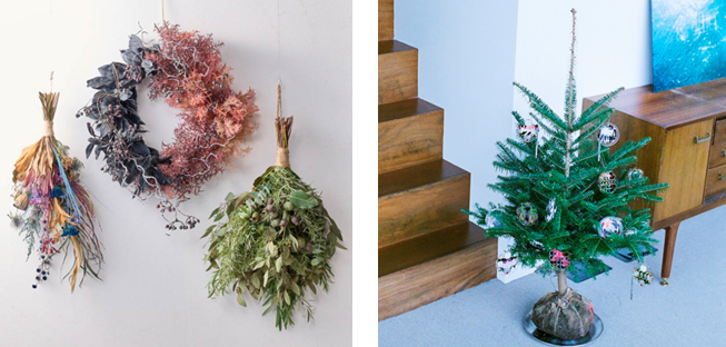 <カーサツリー>のクリスマスツリーは、生きたもみの木をお届けし、クリスマス後にもみの木を回収。農家にて植樹をして、循環型の経済を目指すというプロジェクトです。また、日本橋・兜町の<フラワーズ フェテ>や、南青山の<ウルス フラワー>など人気のフローラルデザインショップから、フレッシュ、プリザーブド、ドライ、アーティフィシャルと、お洒落なリースやスワッグも登場します。