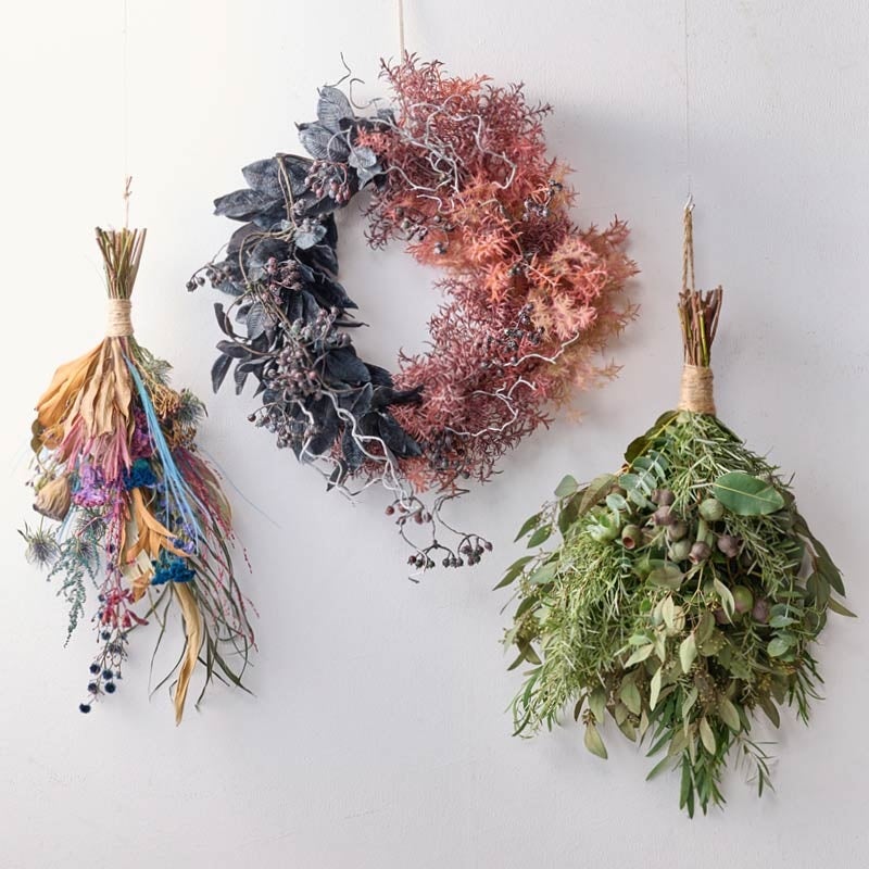 左<フラワーズ フェテ>スワッグ 16,500円から (ドライ)/リース 44,000円から (アーティフィシャル)