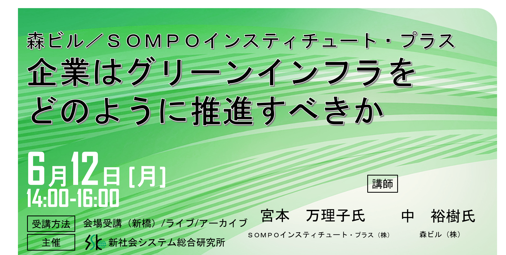 「企業はグリーンインフラをどう推進すべきか」と題して、SOMPOインスティチュート・プラス(株) 宮本 氏、森ビル(株) 中 氏によるセミナーを2023年6月12日(月)に開催!!