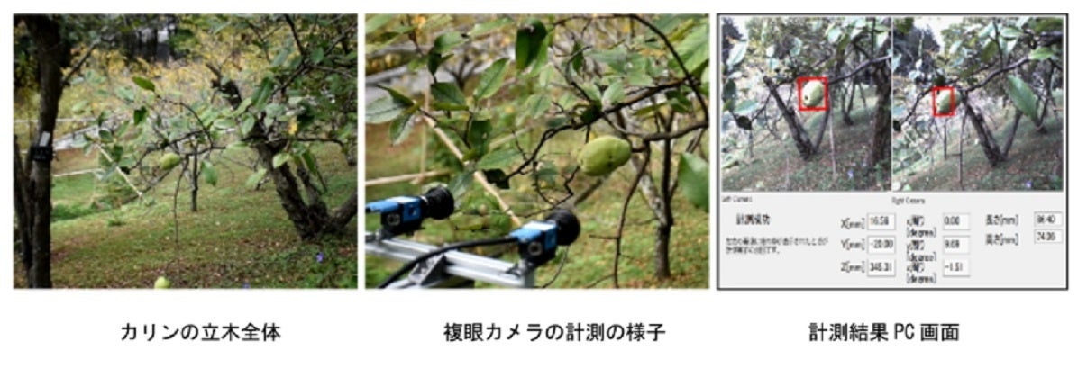 立木果樹カリンを写した写真(左)、果実部分を拡大撮像するため果実に接近した計測中のカメラ部の写真(中)、複眼計測完了時のコンピュータ画面(右、左右カメラで認識されたカリンの実を赤い枠で示す)。