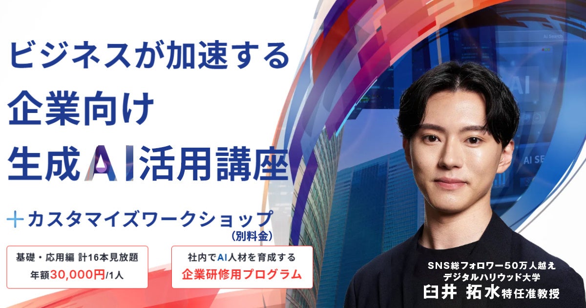 デジタルハリウッド大学 臼井 拓水特任准教授と共同開発|法人向け「生成AIビジネス活用講座」提供開始