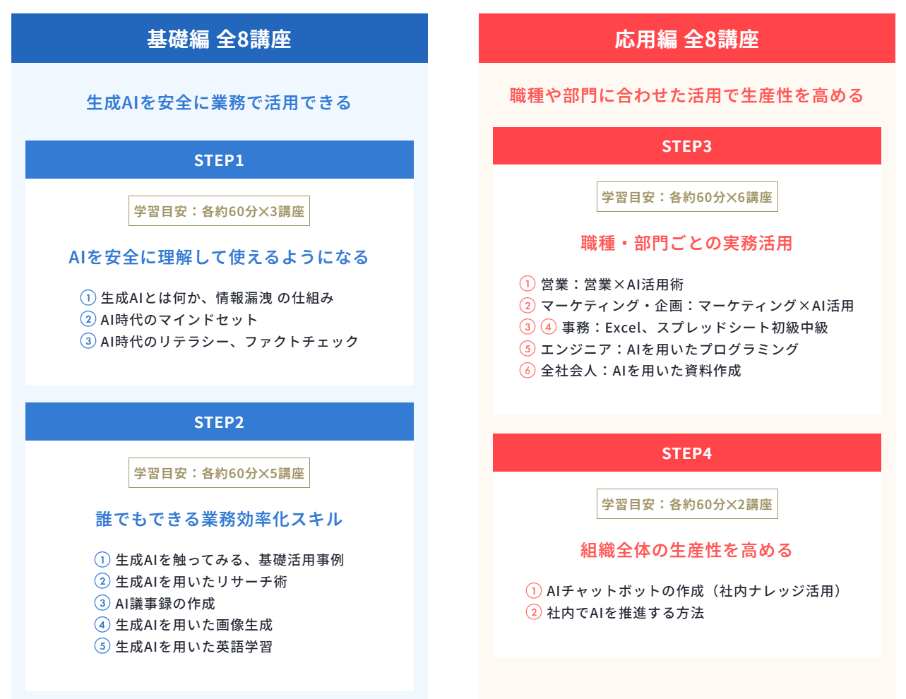 本講座は、生成AIを安全かつ効果的に業務へ導入するための知識とスキルを体系的に学べる教育パッケージであり、生成AIツールの実践的活用を通じて、「AIを使える人」から「AIで成果を出せる人」へステップアップできる構成となっています。