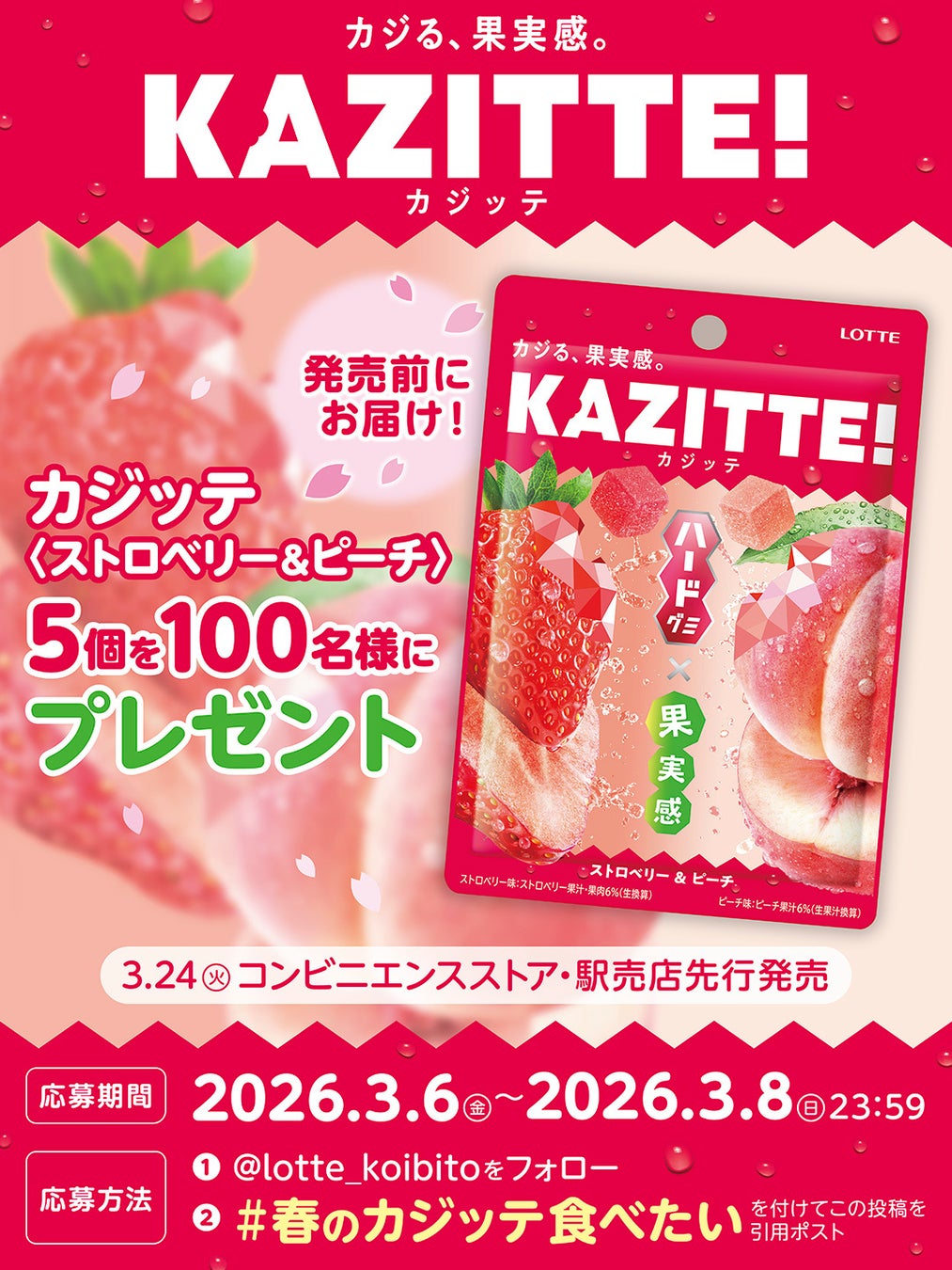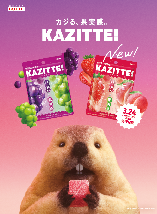 株式会社ロッテ(東京都新宿区、代表取締役社長執行役員:中島英樹、以下ロッテ)は「カジッテ〈ストロベリー&ピーチ〉」を2026年3月24日(火)にコンビニエンスストア・駅売店先行で発売します。「カジッテ」はロッテ独自の「果実感引き立て製法」を用い、ハードグミの新ブランドとして2025年8月に発売しました。ひと口カジった瞬間に、ハードな食感と広がる果実感が楽しめるこだわりの味わいとマーモットを使ったプロモーションによってSNSを中心に話題が広まったことで、出荷実績は計画比の約150%(*)と好調です。仕事中の小腹満たしやリフレッシュしたいときなどに、ぜひお楽しみください。