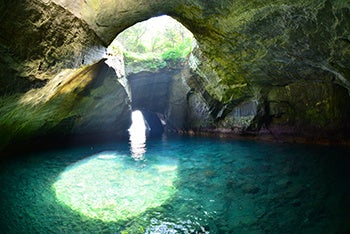 堂ヶ島にある白い凝灰岩にできた海蝕トンネル。遊覧船で入り天井が丸く抜け落ちた天窓まで進むと、暗い洞窟の中に光が差し込み、水面がブルーやグリーンの美しい色彩を放ちます。天窓洞の上には堂ヶ島公園内の遊歩道があり、天窓の下を通る遊覧船を真上から見ることもできます。春から秋のお昼前後が特にきれいに見えるのでおすすめです。