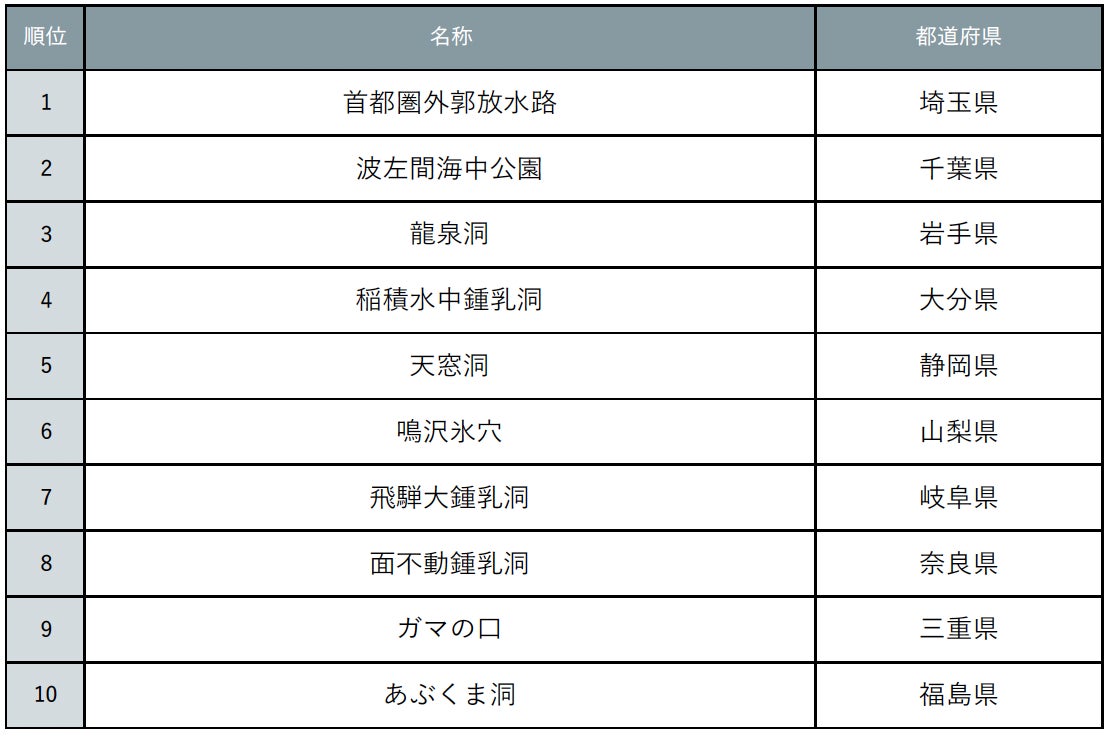 そのほかトップ10には、自然の神秘を感じられる非日常空間がずらりと並ぶ結果となりました。洞窟など天然クーラーでひんやり過ごせるスポットは、それだけで暑さも時間も忘れて過ごせそうです。ランキング結果を参考に、この夏は“異世界”絶景スポットで、冒険気分を味わってみてはいかがでしょうか。