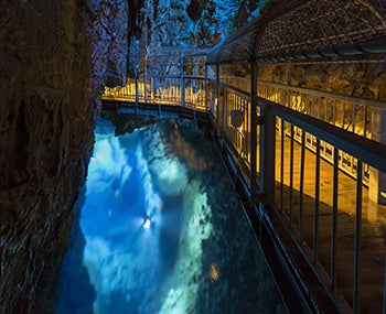 総延長は判明しているところで4,088m、発見された地底湖は8つ、現在も調査継続中という日本有数の鍾乳洞です。長い時間をかけて生まれた芸術品のような鍾乳石が広がります。一番の見どころは、水の透明度の高さから“ドラゴンブルー”と称され深い青色に輝く地底湖。約270段の階段を進んで「第一地底湖展望台」まで行くと、地底湖を上からのぞき込むことができます。