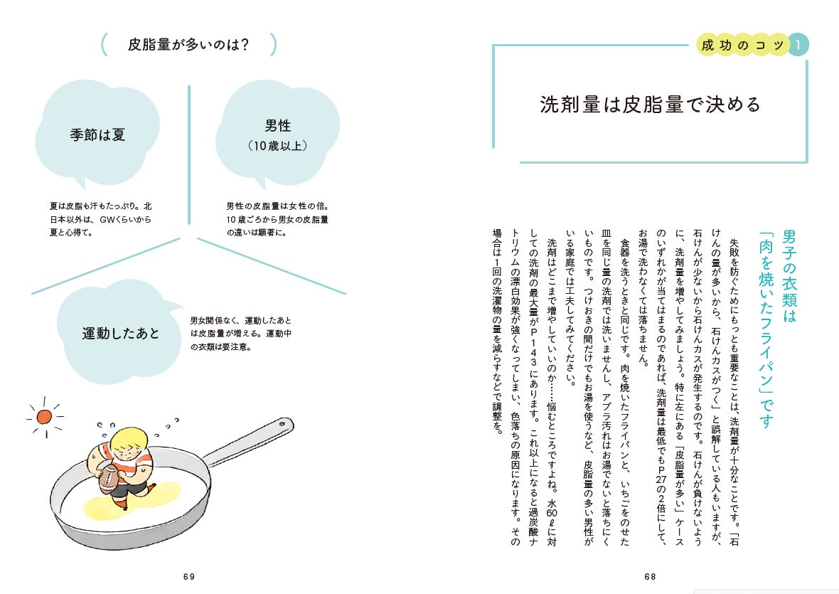 石けんカスがつく、汚れが落ちていない、シャツが黄ばむ… 失敗例と対処法も豊富に掲載。成功のコツも紹介します。例えば、「洗剤量は皮脂量で決める」こと。男子の衣類は肉を焼いたフライパンと同じように、汚れも汗もたっぷりついています。