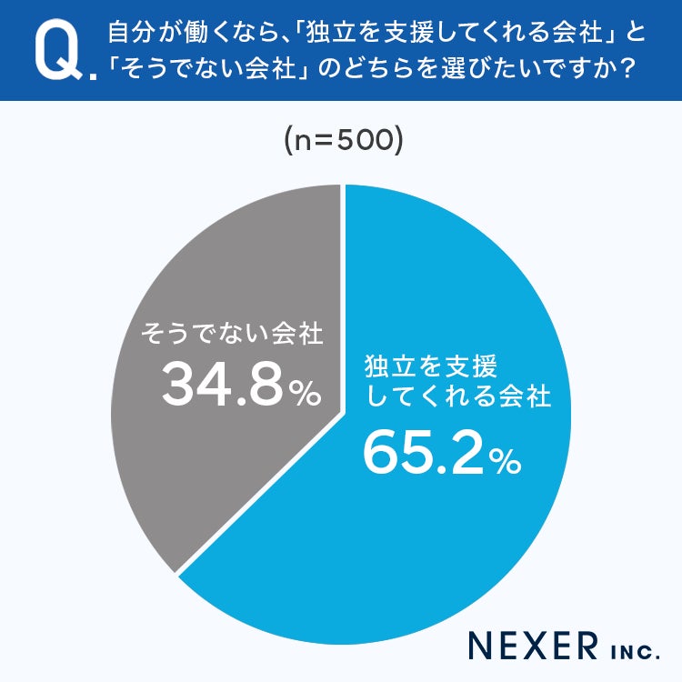 その結果、「独立を支援してくれる会社」が65.2%、「そうでない会社」が34.8%となり、独立支援のある会社を選びたいと考える人が多いことがわかりました。