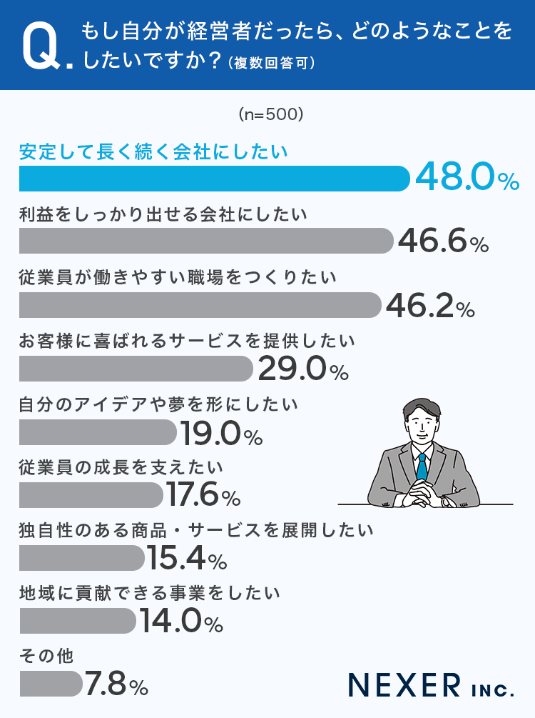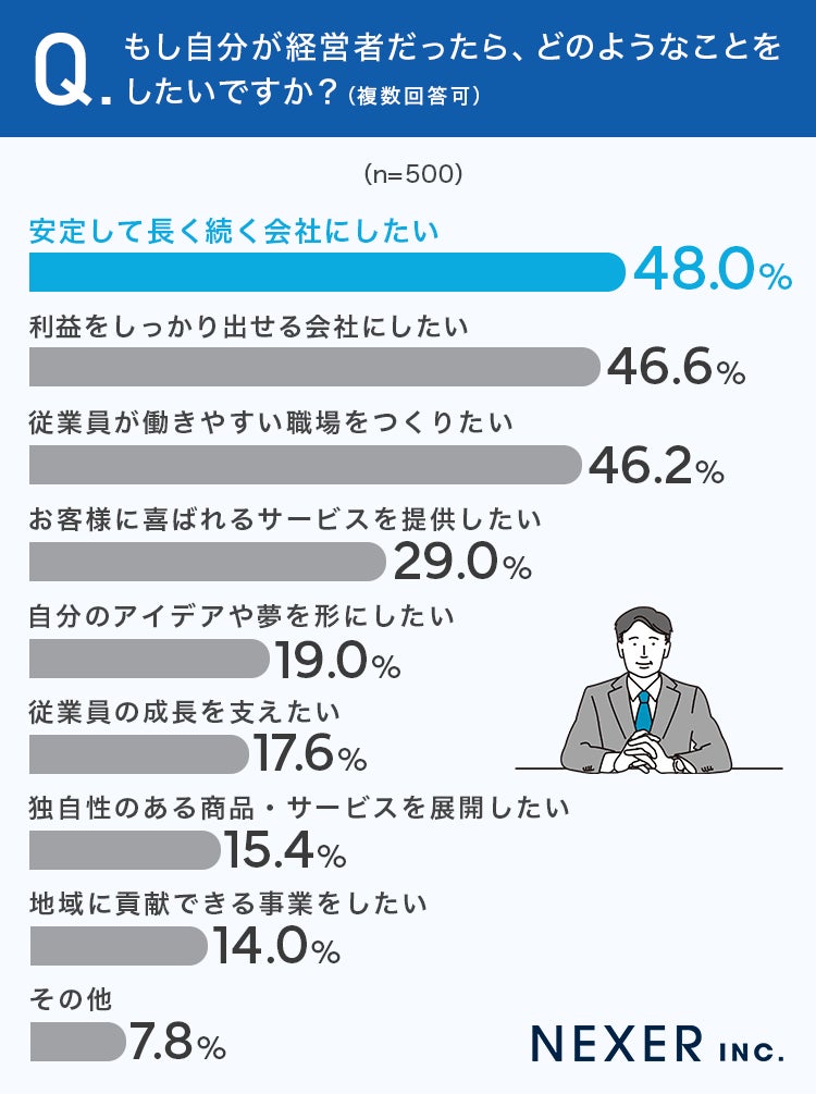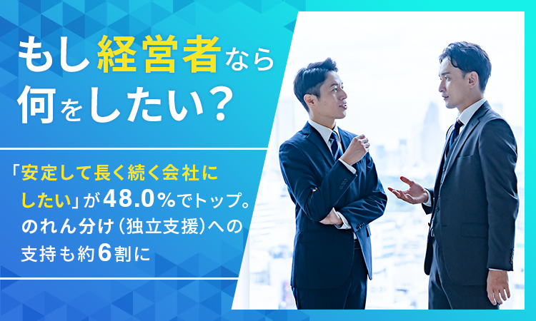 もし経営者なら何をしたい?「安定して長く続く会社にしたい」が48.0%でトップ。"のれん分け(独立支援)"への支持も約6割に