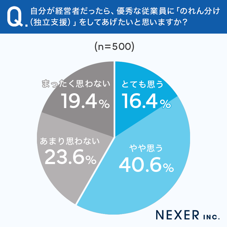 「とても思う」が16.4%、「やや思う」が40.6%で、合わせて57.0%の人がのれん分けに前向きな姿勢を示しました。一方で「あまり思わない」は23.6%、「まったく思わない」は19.4%で、否定的な意見は合わせて43.0%となりました。