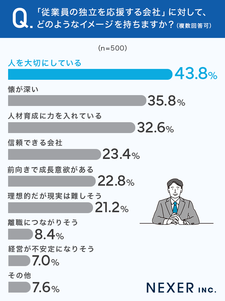この結果から、従業員の独立を応援する姿勢は、全体として好意的に受け止められていることがうかがえます。