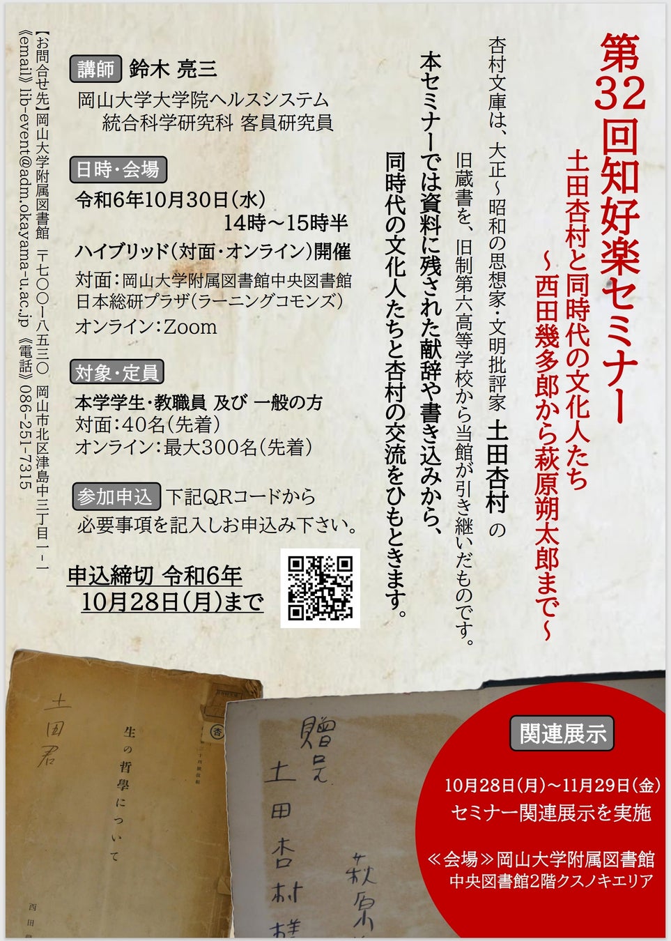 【岡山大学】岡山大学附属図書館 第32回知好楽セミナー「土田杏村と同時代の文化人たち~西田幾多郎から萩原朔太郎まで~」〔10/30,水 ハイブリッド開催〕