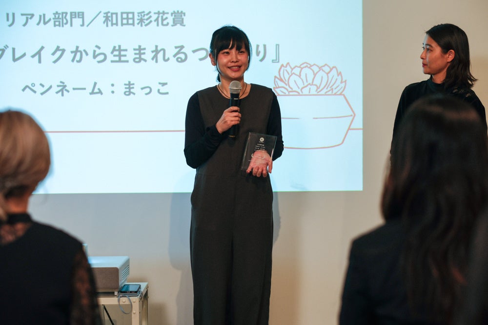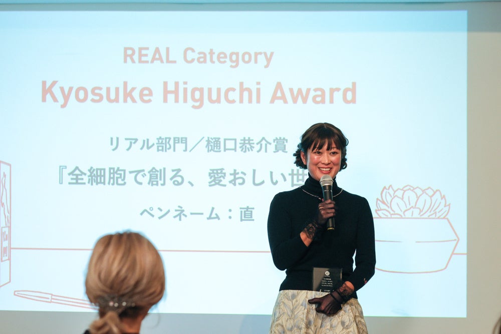 この素晴らしい賞をいただけて本当に嬉しいです。エッセイ応募のテーマを見て、「ああ自分のことだ」とまず思って書いてみたいと思ったのと、応募条件の中に「授賞式に参加できる方」と書いてあって、「今だったら人の前に立てるかもな」と思い、応募するきっかけになりました。去年の今頃でしたら暗黒の中におり、人の目を避けて過ごしていて、そもそも文章を書くという挑戦も出来なかったので、本当にこの場に来られて嬉しいです。アトピーに限らず(樋口さんが)仰っていただいたように、自分がなったことのない病気や他の方の悩みに、なかなか寄り添うことが出来なかったりしますが、例えば私の文を読んでいただいて、少しでも自分のことのように思ってくださる方が増えるなら、今回応募してよかったと思います。「ジブンをこわしてつくって」という……私の見えている世界がどんどん鮮やかになっていく感じがしました。