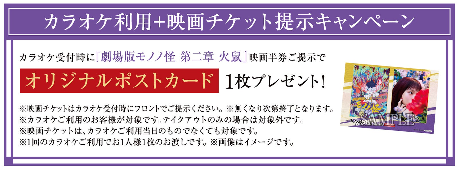 カラオケ利用+映画チケット提示キャンペーンとして、『劇場版モノノ怪 第二章 火鼠』のチケット(ムビチケ、電子チケット、半券等)をカラオケご利用の受付時にご提示いただくと、オリジナルポストカードを1枚プレゼントします!