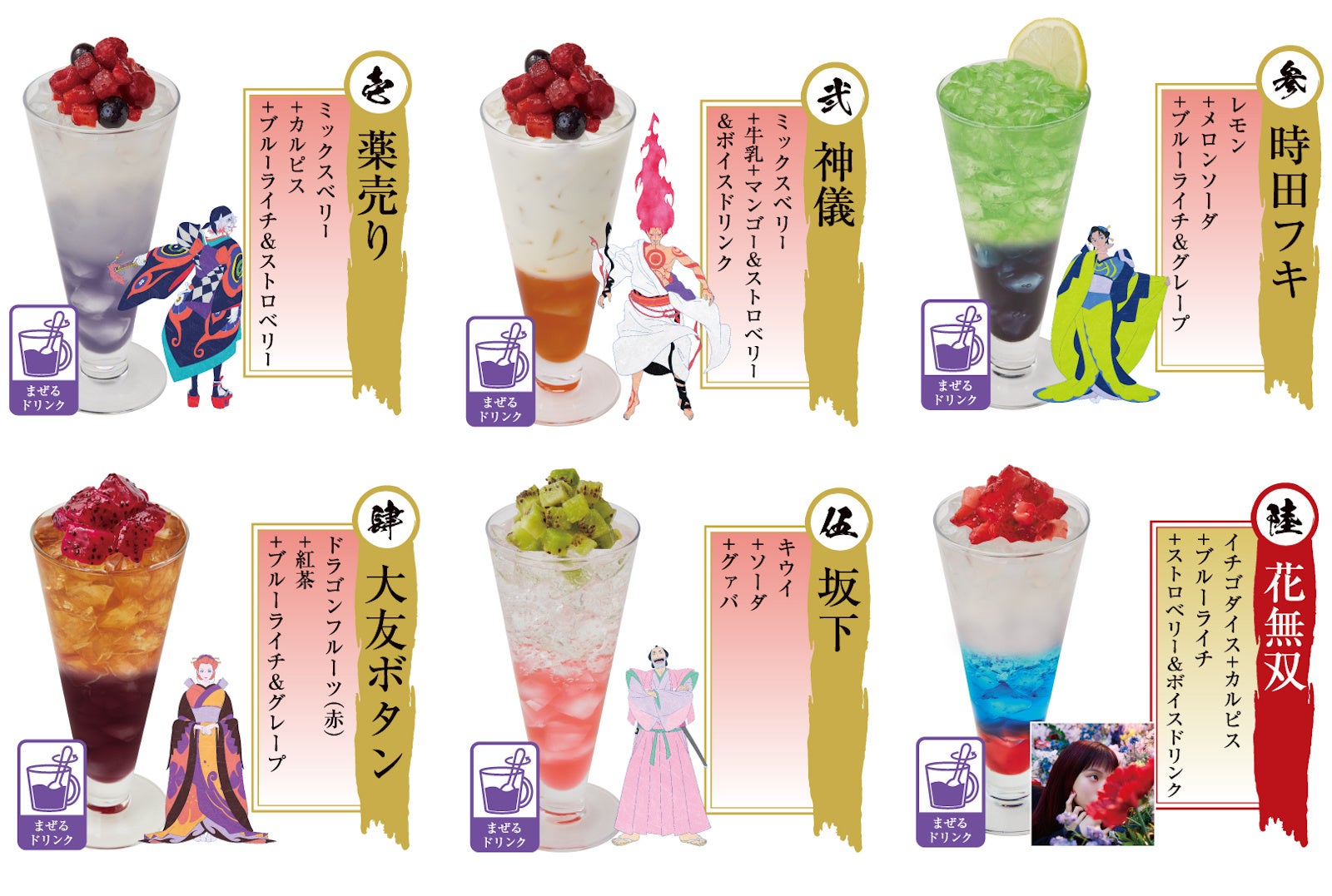 コラボドリンクは、『劇場版モノノ怪』登場人物の「薬売り」「神儀」「時田フキ」「大友ボタン」「坂下」の5種と、アイナ・ジ・エンドさんが歌う主題歌「花無双」をイメージした全6種をご用意します。また一部店舗ではドリンクのテイクアウト販売も実施!