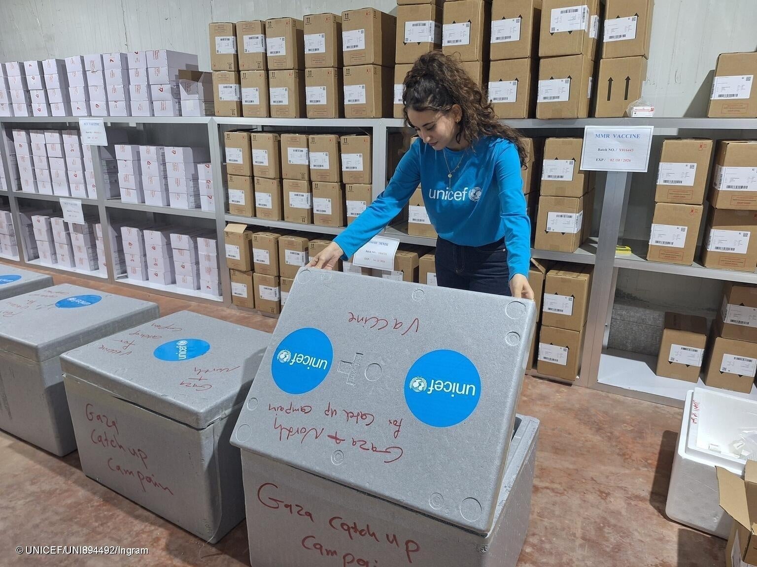 3回にわたるキャンペーンに向け、ユニセフはガザ地区に、11の感染症に対するワクチン(混合ワクチンを含む)、注射器、コールドチェーン(低温物流システム)機材、栄養補給物資を搬入しました。ユニセフは他国連機関やパレスチナ保健省と共に、ガザ地区全域の子どもに予防接種を実施するため、接種担当者や現地で啓発活動を行う人々を支援する詳細な計画を策定しています。予防接種は、ガザ地区全域で149カ所の保健医療施設と10台の巡回車両を通じて行います。さらにはパートナーなどと共に予防接種の実施を担う450人以上の保健員とスタッフの研修を行い、15カ所の保健医療拠点の復旧にも取り組んでいます。