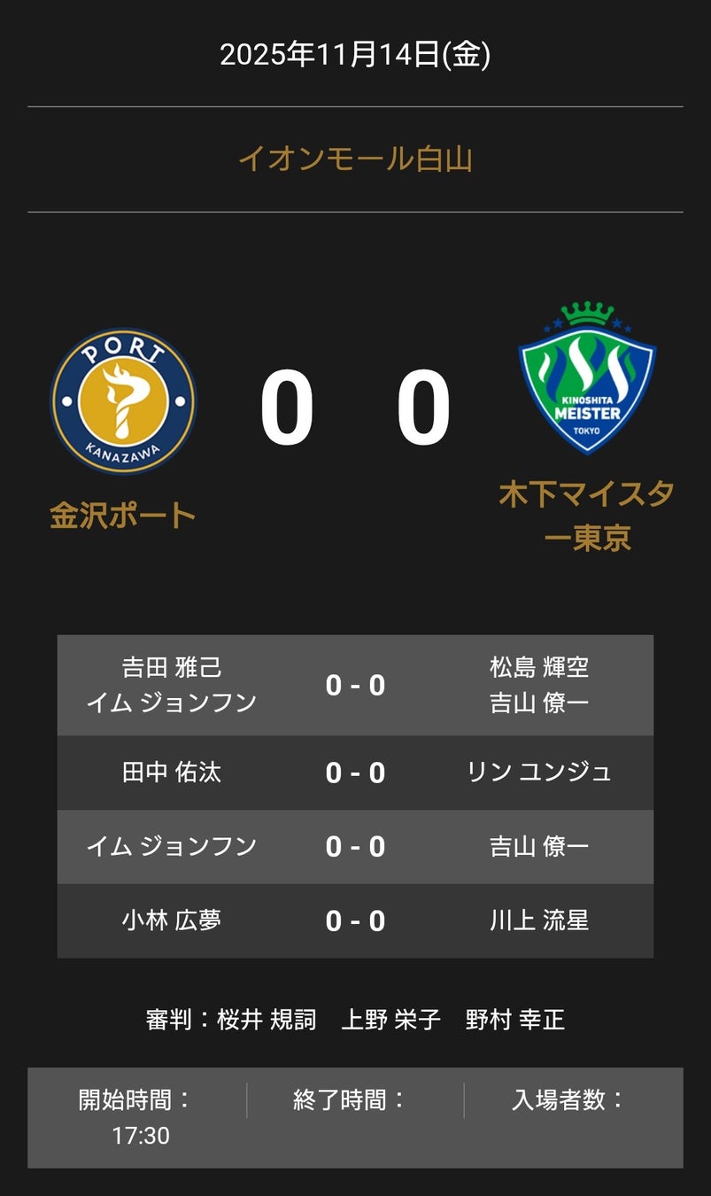 ノジマTリーグ 2025-2026 公式戦 11月14日開催 金沢ポート vs 木下マイスター東京 オーダー発表