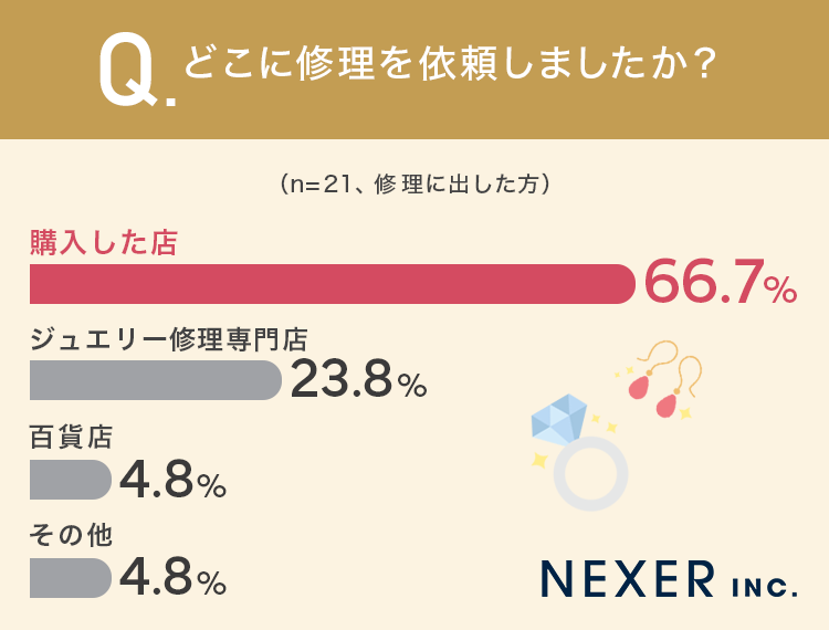 最も多かったのは「購入した店」で66.7%となり、多くの人がまずは購入した店舗に相談していることがわかります。続いて「ジュエリー修理専門店」が23.8%、「百貨店」が4.8%、「その他」が4.8%という結果でした。