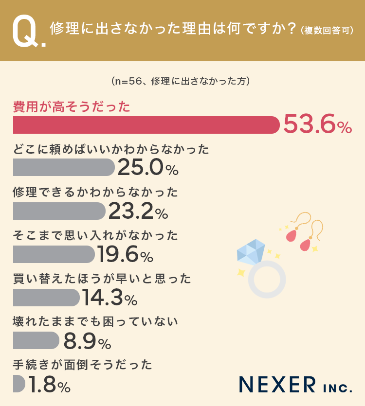 今回の調査では、ジュエリー・アクセサリー所有者の半数が「壊れたり傷んだりした経験がある」と回答した一方、そのうち修理に出した方は3割にも届かないという結果になりました。