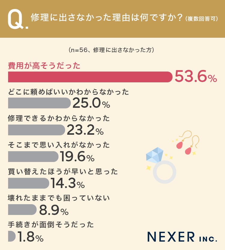 ジュエリー・アクセサリーが壊れた経験、半数が「ある」と回答。修理に出さなかった理由は「費用が高そう」が最多に