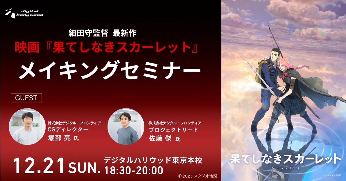 IT・デジタルコンテンツ分野の人材育成スクール「デジタルハリウッド」(運営:デジタルハリウッド株式会社/本社・本校:東京都千代田区、代表取締役社長兼CEO:春名啓紀、学長:杉山知之)は、株式会社デジタル・フロンティアの堀部亮氏と佐藤傑氏をゲストに迎え、細田守監督の最新作映画『果てしなきスカーレット』の制作秘話に迫るメイキングセミナーを2025年12月21日(日)に開催いたします。