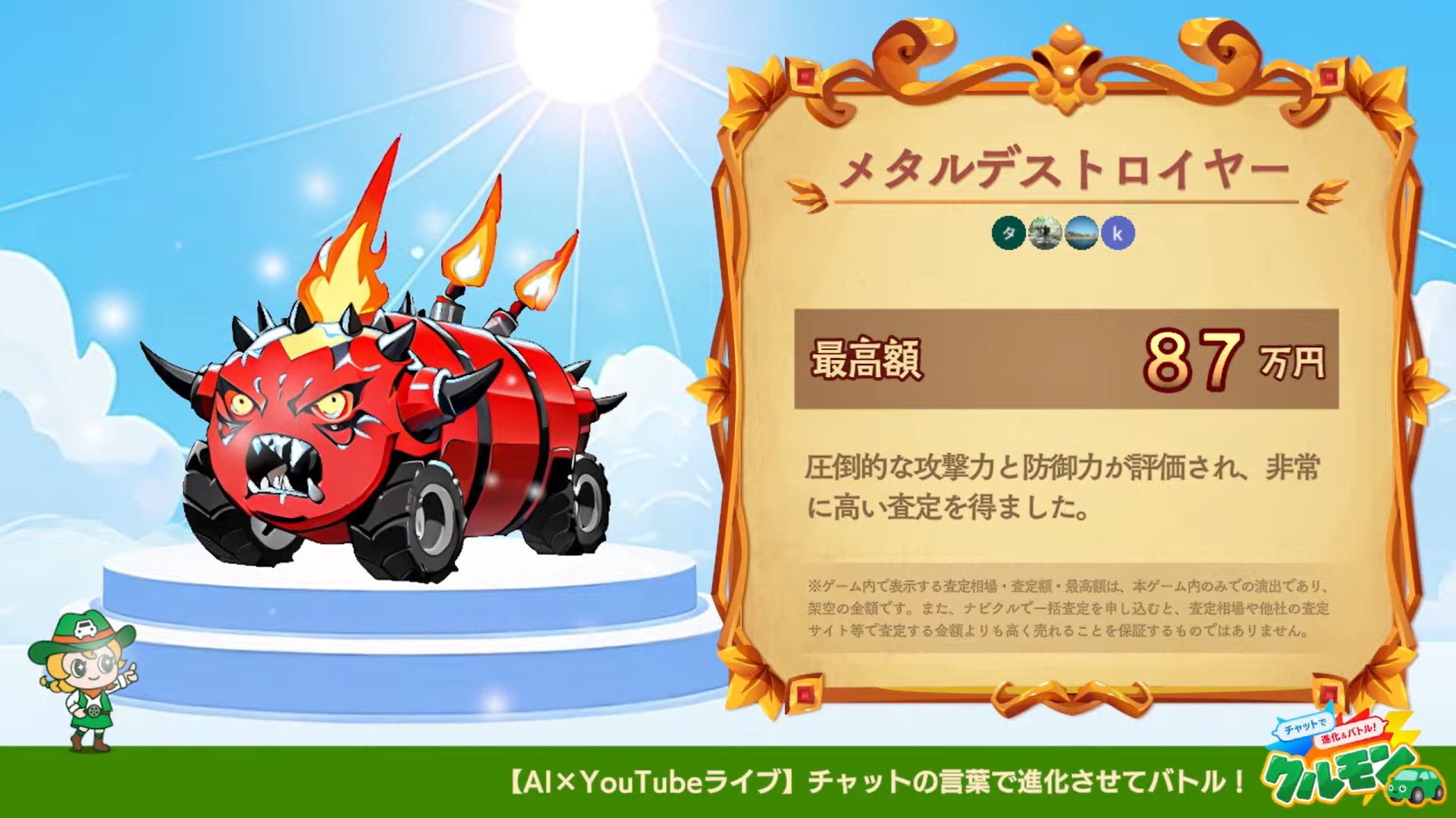 YouTubeライブゲーム『クルモン』は、車査定・車買取サイト「ナビクル」の「クルマが高く売れる」というサービスの最大の特徴を体現した、みんなでゲームを楽しみながら遊べる「AI×YouTubeライブの新しい参加型ゲームコンテンツ」です。YouTubeライブのチャット機能を利用して参加者同士が交流しながらクルマモンスターをリアルタイムで生成することができます。チャットに打ち込まれる参加者の「コメント」をAIが吸収・判別し、その言葉を吸収したクルマモンスターが次々と進化。果たしてどんな『クルモン』が完成するのか!?さらにその進化したクルモン同士がバトル!クルマならではの攻撃や必殺技を使った戦いが繰り広げられます。そして、バトルを終えたクルモンの査定の最高額を発表。連勝の数だけ「連勝ボーナス」が追加されるなど、目が離せないお楽しみが盛りだくさん!査定額ランキングで競い合おう!