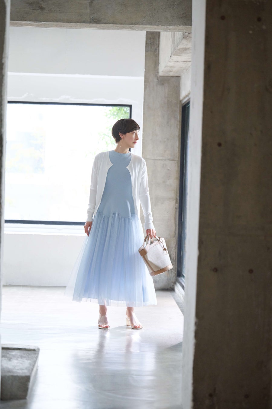 インナーのキャミドレスにパニエがついているけれど、ボリュームがほどよいので甘くなりすぎず大人にも着やすいと感じました。
