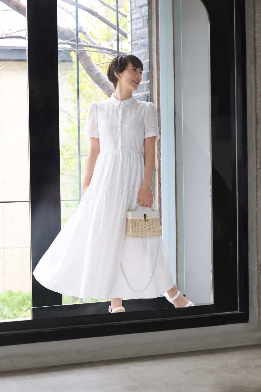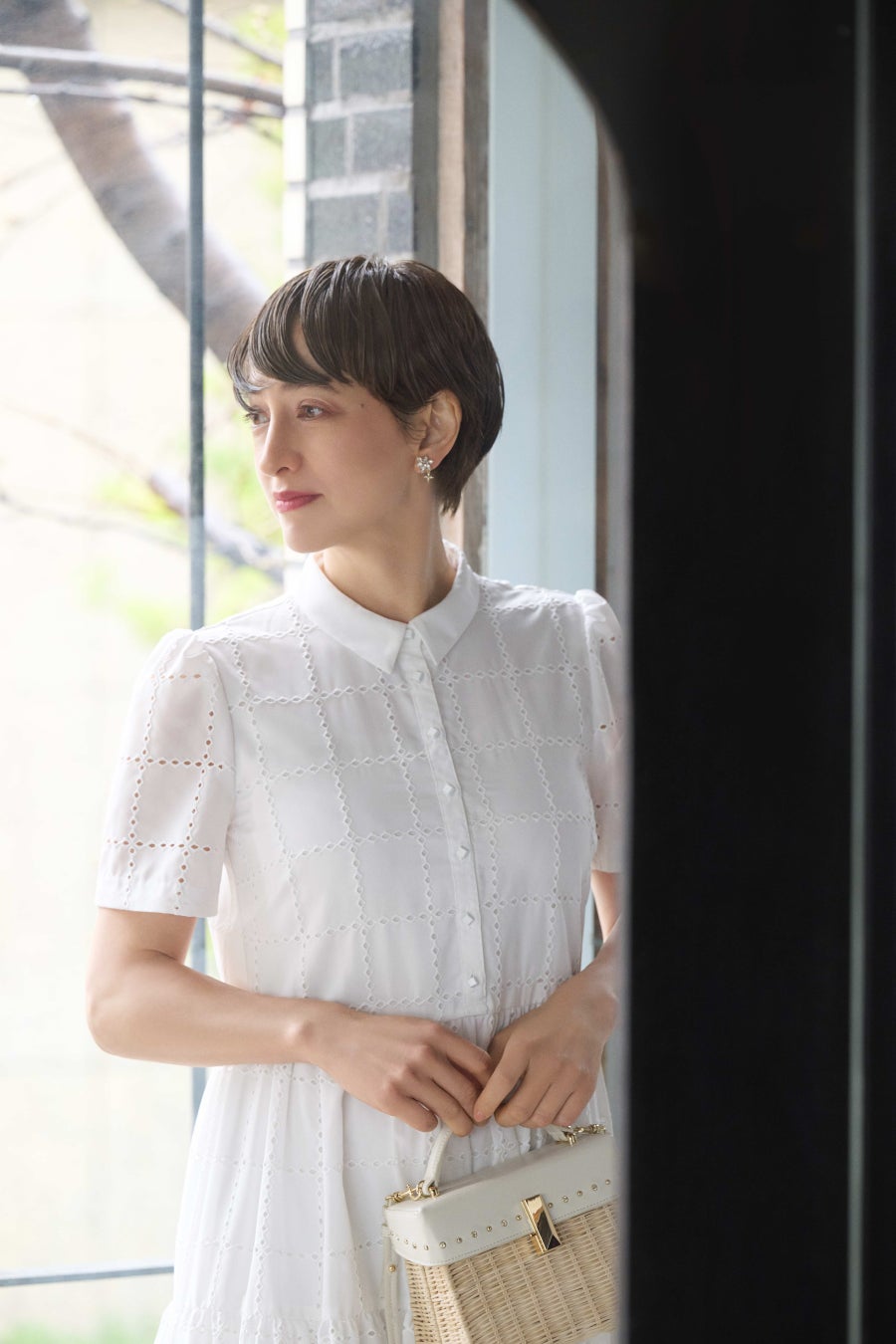 バカンス先こそファッションを楽しみたいというクリステルさんに、ディナーやお呼ばれの場など、ちょっとしたきちんとシーンにも活躍できるよう、シワになりにくく1枚で爽やかで洗練された雰囲気を演出してくれるエンブロイダリーのシャツドレスを作りました。