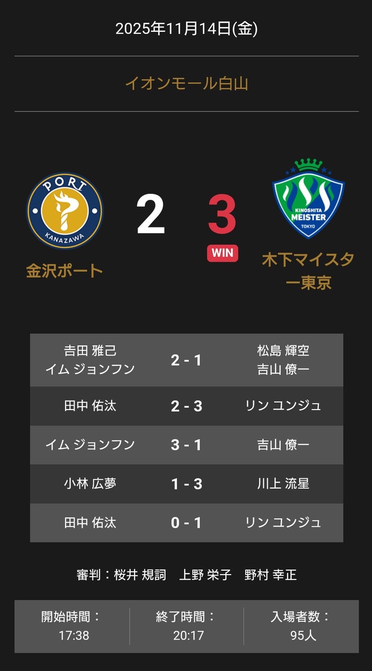 金沢ポートと木下マイスター東京の試合は、3-2で木下マイスター東京が勝利しました。