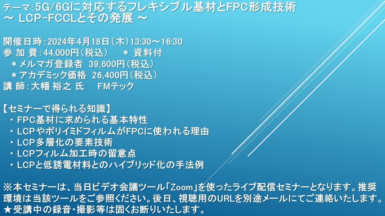 【ライブ配信セミナー】5G/6Gに対応するフレキシブル基材とFPC形成技術 〜 LCP-FCCLとその発展 〜 4月18日(木)開催 主催:(株)シーエムシー・リサーチ
