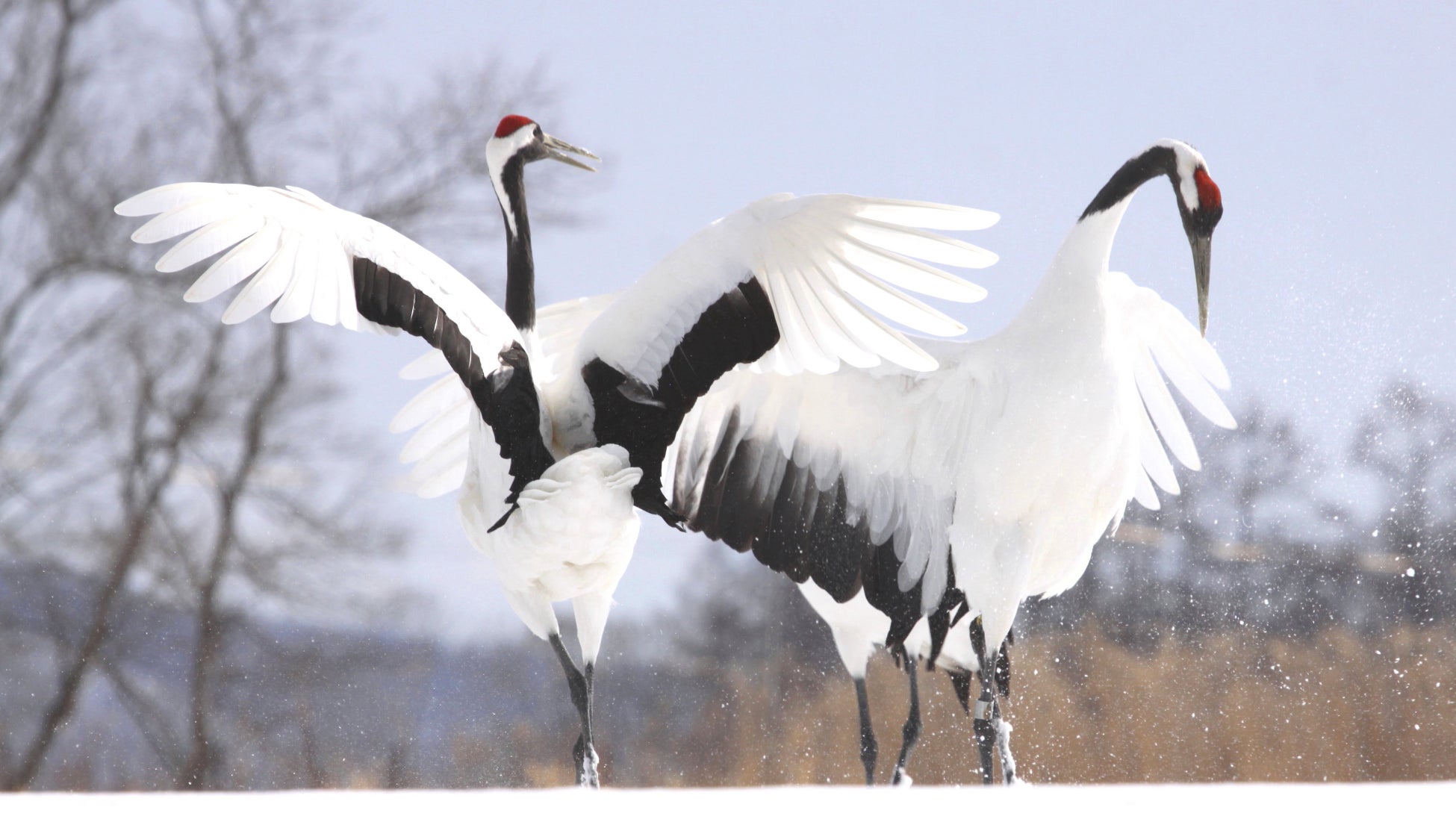 ・真っ白な雪原に舞うタンチョウは冬の風物詩とされ、タンチョウの白は雪よりも