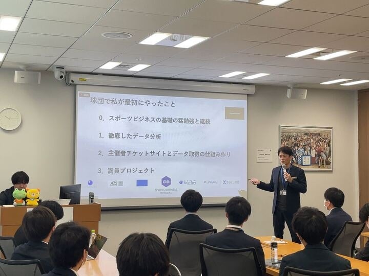 新たに始まる第3期の受講生は21名。講義は4月から10月までの土曜日に合計23講義日、合計42コマを予定しています。開講式では運営責任者・長野雄二が、外資系のIT業界からプロ野球業界転職した自身の経歴を元に、なぜ転職できたのか、どういったスキルが球界の役に立ったのかを説明。スポーツ業界が求める人材については、「スポーツの価値を最大化できるスキルが非常に重要」と、「スポーツのよさを世に発信すること」「社会の課題解決をするという高い意識を持つこと」「チームワークを意識すること」などの具体的な事例についても触れる場面も。そして、「“原理原則”を現場で応用できるようになってほしい」「同期生を大事にしてほしい」と希望。「7ヵ月後、皆さんの夢の実現のスタートラインに立てるように全員でがんばっていきましょう」と激励しました。