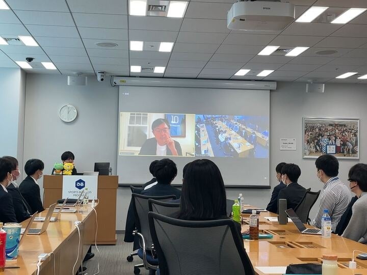 午後はアメリカ在住のBLUE UNITED CORPORATION 中村武彦常任講師がリモートで登壇し、「自分自身のため、自分の好きなチームのためだけではなく、自分自身が日本のスポーツ業界を世界のトップレベルにするための予備軍だと思って講義を受けてもらえればと思います」と鼓舞。最初の講義となる「スポーツビジネス概論」を展開すると、受講生たちも次々に発言や質問をするなど、さっそく積極的な姿勢を見せていました。