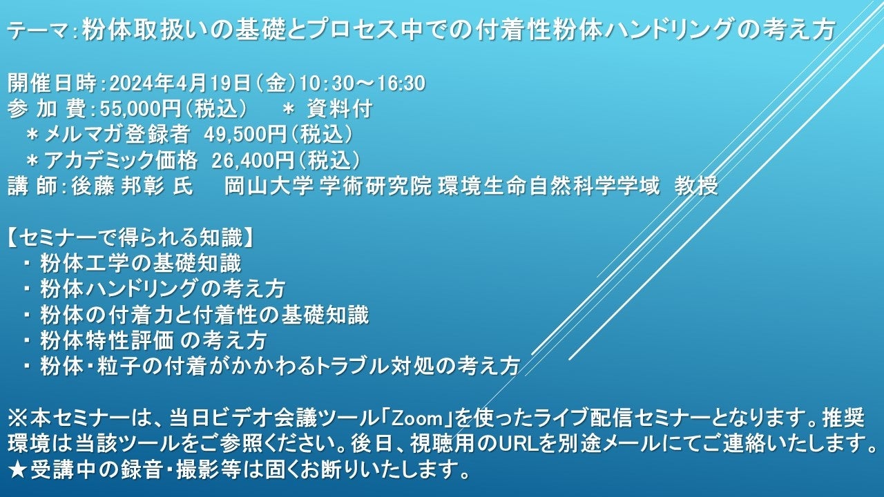 【ライブ配信セミナー】粉体取扱いの基礎とプロセス中での付着性粉体ハンドリングの考え方 4月19日(金)開催 主催:(株)シーエムシー・リサーチ