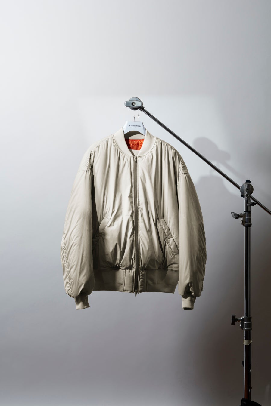 ポンチョ風にも着用できる2WAY仕様のMA-1ブルゾン。中綿をしっかりと備えたアウター仕様で、軽量ながら確かな保温性を発揮。また光沢のあるポリエステルタフタ素材で快適さと存在感を両立。FUMITO GANRYUらしい実験的な発想と「MODE COMMUTER」の機能美が融合した、日常からモードまで活躍する革新的な一着です。