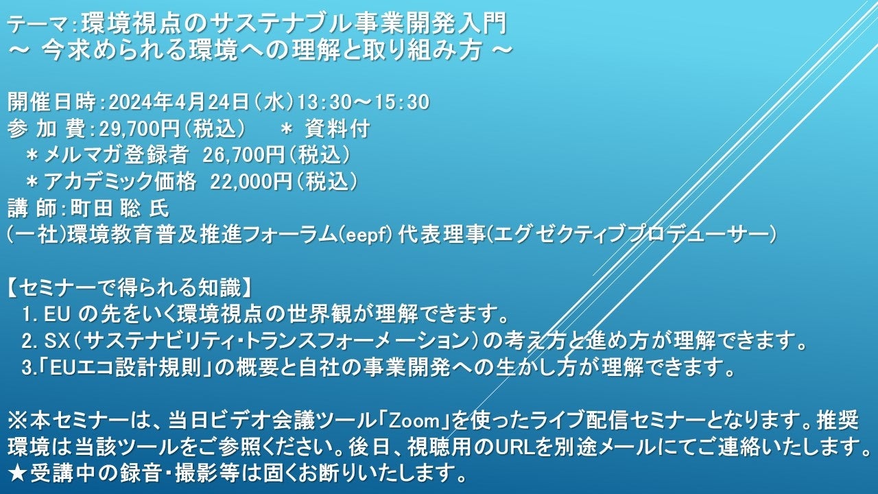 【ライブ配信セミナー】環境視点のサステナブル事業開発入門~ 今求められる環境への理解と取り組み方 ~ 4月24日(水)開催 主催:(株)シーエムシー・リサーチ