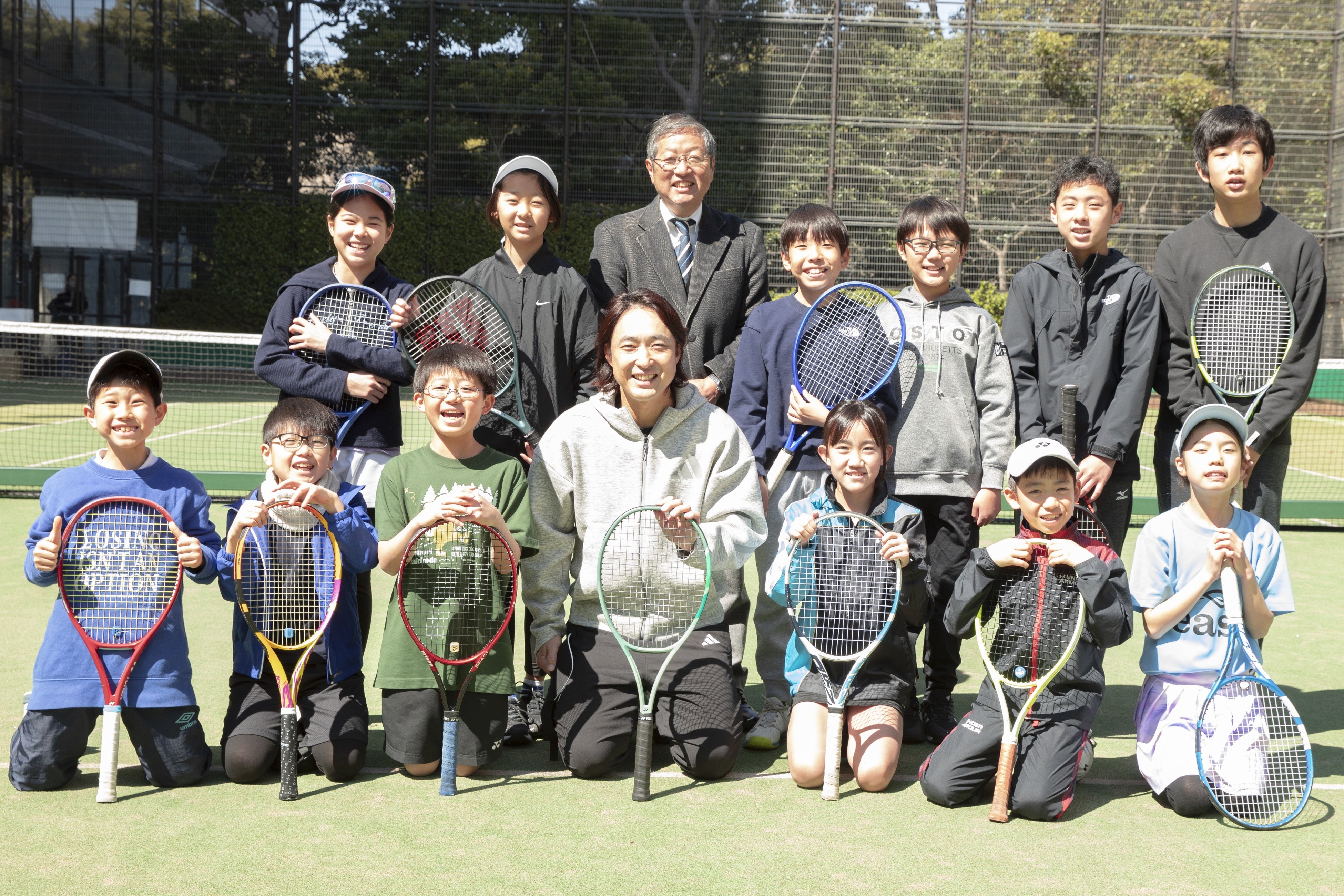 後半は同施設テニスコートへ移動し、添田氏指導のもと、ガムを噛みながらサーブやレシーブ、ラリーなどの練習に挑戦しました。添田氏は「厳しい練習を乗り越えて強くなってほしい。とにかく続けることが大事。テニス教室、噛むことの話に気づきを得て、今後に取り入れてほしい」と熱いエールを送りました。児童からは「これからは噛むことを気にしてみようと思いました」「添田さんに教えてもらえて嬉しかったです。ガムを噛みながら楽しく練習できました」といった感想が聞かれ、スポーツにおける「噛む力」の重要性を実体験できた貴重な機会となりました。