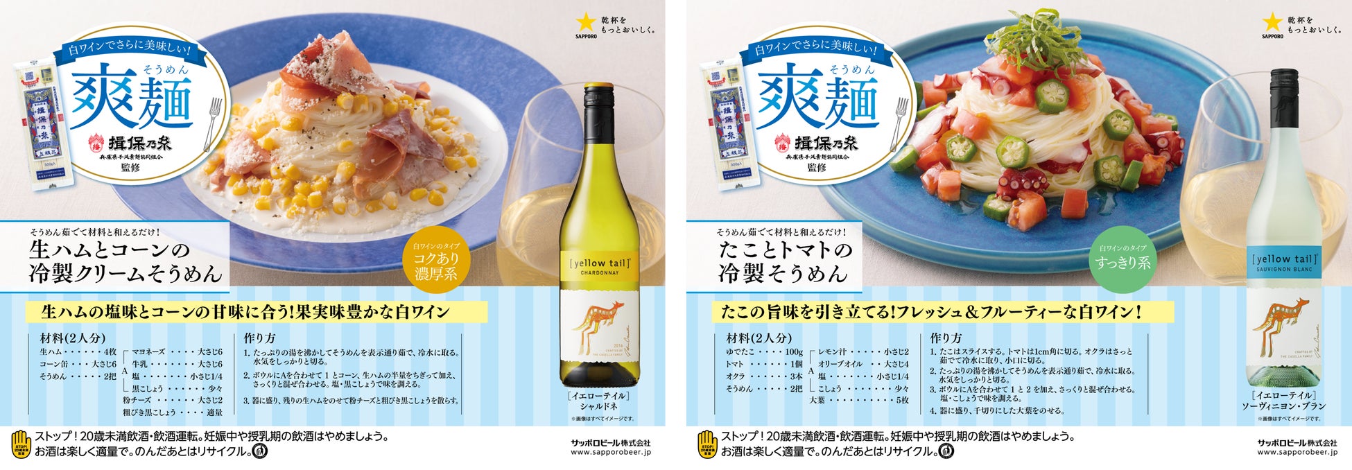 サッポロホールディングス(株)のグループ企業であるサッポロビール(株)は、販売する白ワイン[イエローテイル]、タリケ、パラ・ヒメネス、グランポレールなど、9種類の商品に合う、揖保乃糸監修アレンジレシピとコラボレーションした企画を提案します。