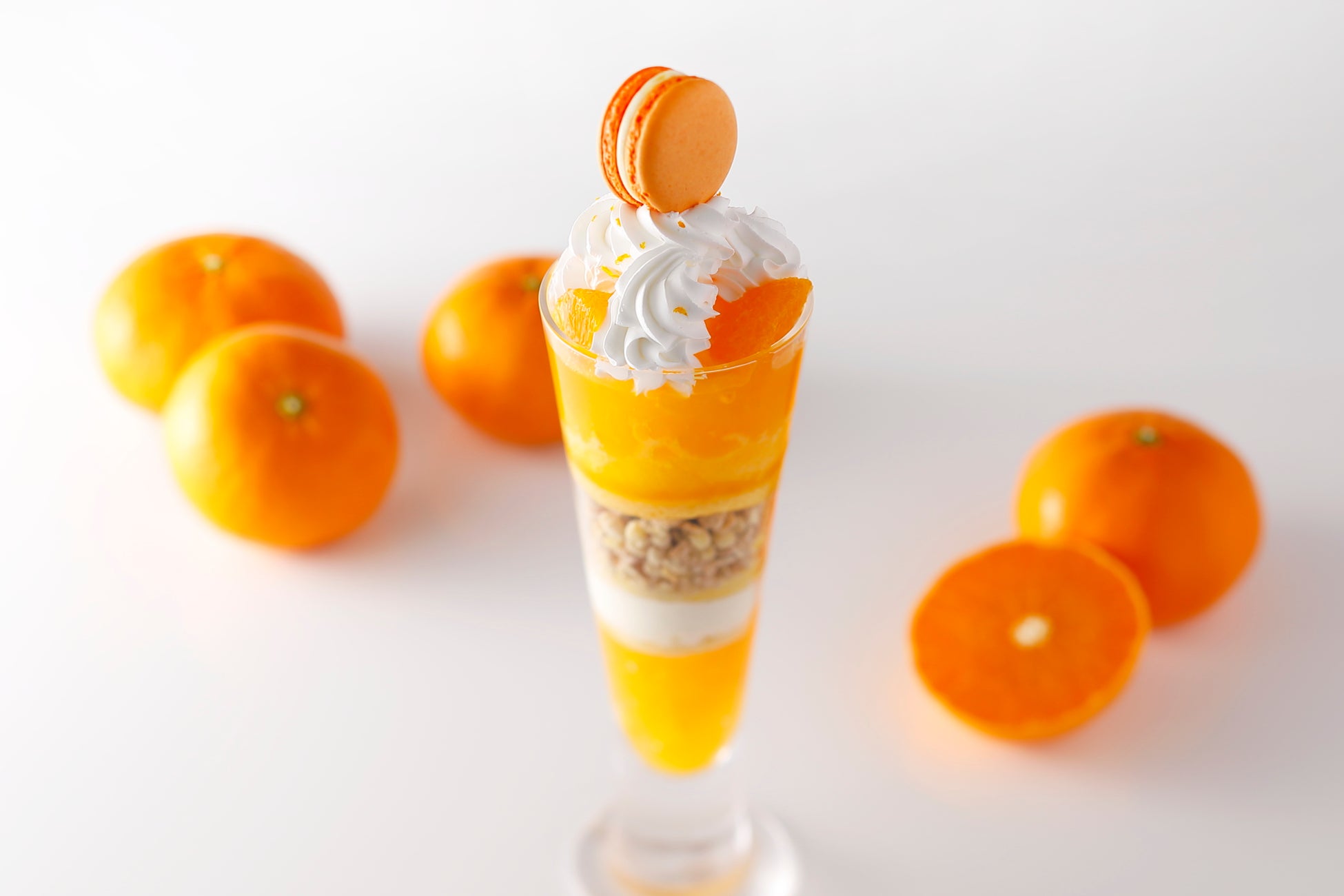 「愛媛かんきつ」を贅沢に使用したご褒美パフェ。たっぷりの果肉・果汁で仕上げたジューシーなジュレ、バニラビーンズ入りのマスカルポーネクリーム、ビスキュイ生地、ホワイトチョコレートでコーティングしたサクサクのシリアルを美しい層に仕上げました。トップには果汁たっぷりのシャーベットに九州大牟田産生クリーム、かんきつジュレを忍ばせたオリジナルマカロンをトッピング。旬を迎えた「愛媛かんきつ」特有の甘みをご堪能ください。
