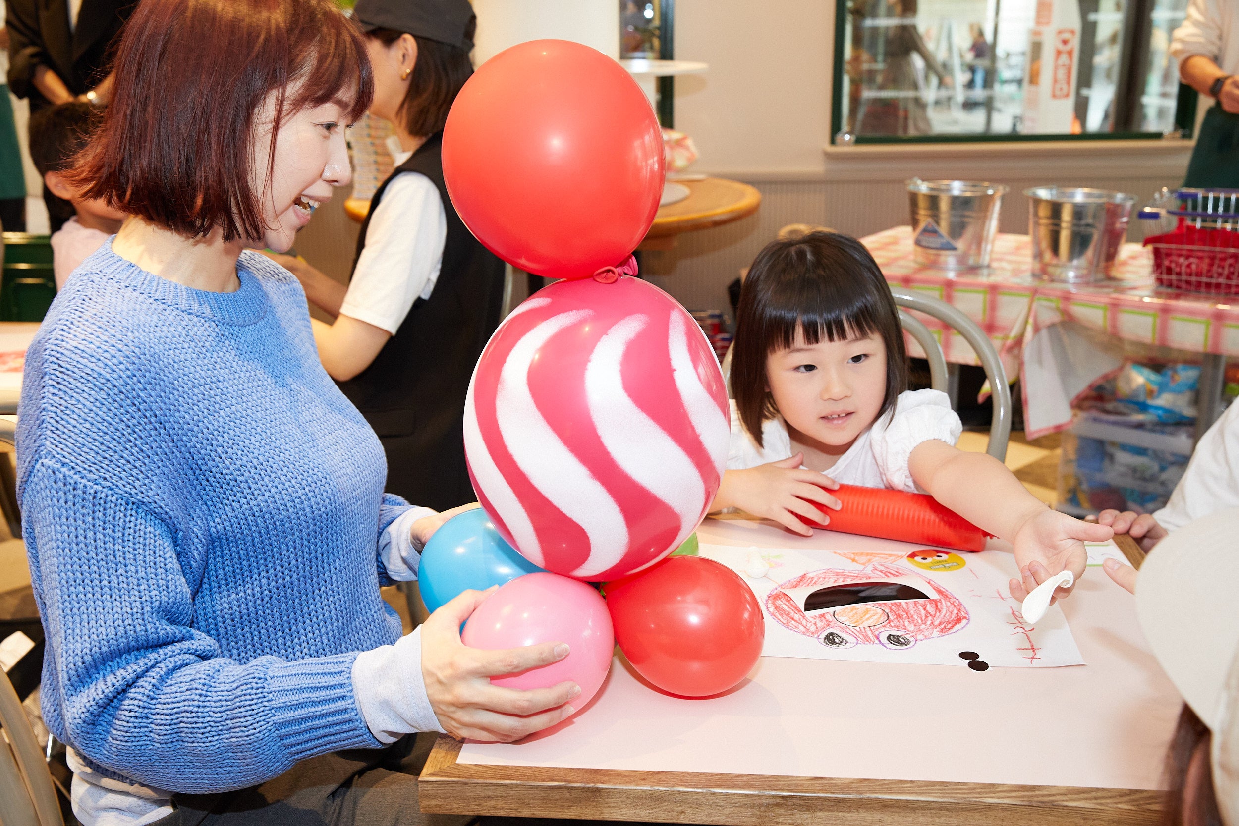 バルーンを膨らませたりつなげる際には細かい作業も多く試行錯誤する場面もありつつ、藤井様や店舗のサポートスタッフとも協力しながら、時には親子でデザイン画を振り返り自由に作る楽しさを味わいながら、にぎやかに行いました。