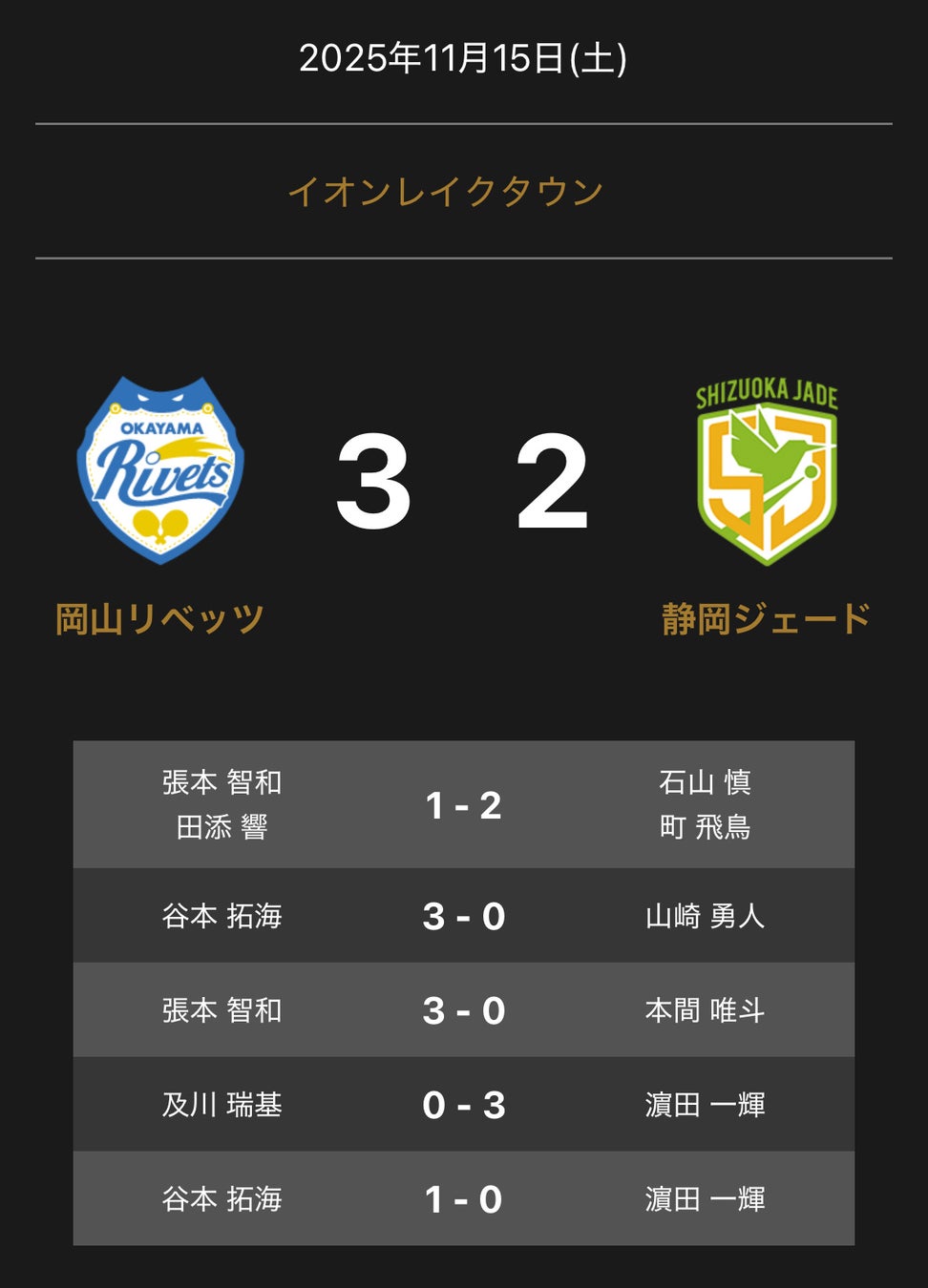 ノジマTリーグ 2025-2026 公式戦 11月15日開催 岡山リベッツ vs 静岡ジェードの試合は3-2で岡山リベッツが勝利しました。