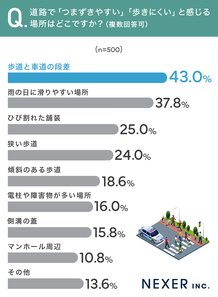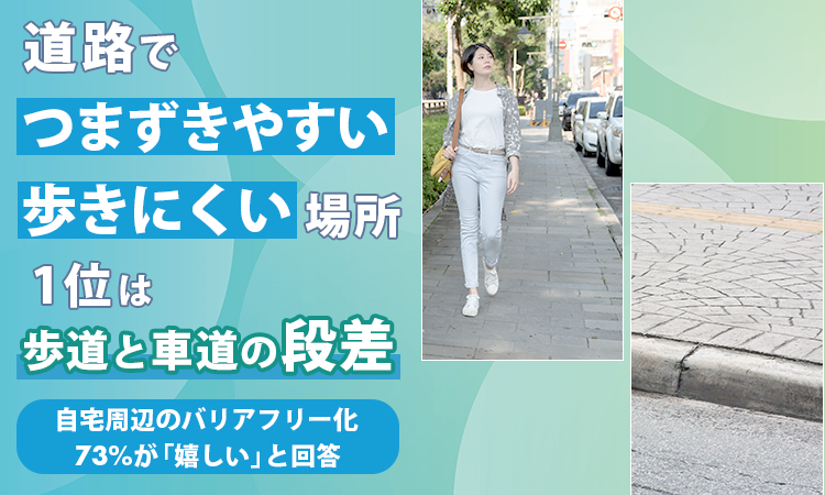 道路で「つまずきやすい」「歩きにくい」場所、1位は「歩道と車道の段差」。自宅周辺のバリアフリー化、73%が「嬉しい」と回答